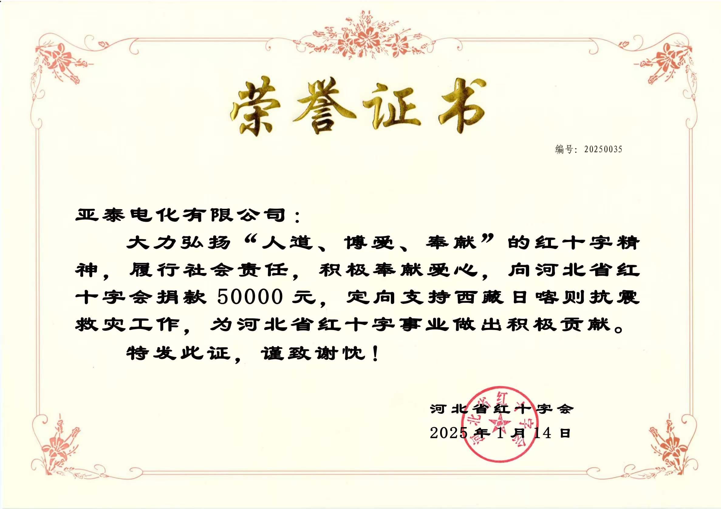 亞泰電化作為一家成立超過30年的民營企業(yè),在發(fā)展歷程中,始終得到了社會各界的廣泛支持和幫助。我們深知,履行社會責(zé)任不僅是我們應(yīng)盡的義務(wù),更是我們回饋社會的一種方式。因此,公司始終將回饋社會、反哺社會作為企業(yè)的核心價值觀之一,致力于成為一家有大愛、有擔(dān)當?shù)钠髽I(yè)。
